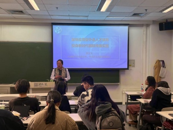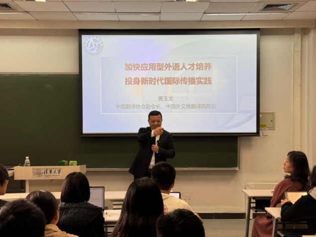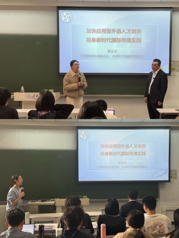 2025年10月15日下午,清华大学外国语言文学系学术沙龙在第六教学楼B108顺利举办。中国外文局翻译院一行莅临外文系,中国翻译协会副会长、中国外文局翻译院院长黄玉龙就“加快应用型外语人才培养,投身新时代国际传播实践”进行讲座,中国外文局翻译院副院长朱颖参加讲座。讲座由清华大学外文系王敬慧教授主持。