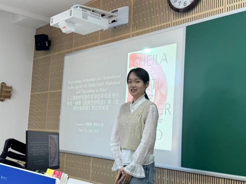 外文系22级本科生纪懿桐在学生分会场·二“数字人文新进展与人工智能时代的文学翻译”中宣读了题为《人工智能时代的作者身份和母亲身份:希拉·赫蒂<房间里的母亲>和<爱丽丝如是说>的比较阅读》的论文。纪懿桐细读了将抛掷硬币纳入写作过程的《房间里的母亲》(2018)和与大语言模型“爱丽丝”对话合写的“爱丽丝如是说”(2023),讨论AI时代人机共创的背景下作者身份的转变,提出了关系性和过程性的“作者系统”的出现,同时她认为AI合作写作是与外部力量协商式写作策略中具有延续性的一环,并将“作者”和“母亲”两种身份作为“孕育”的两种方式进行类比。