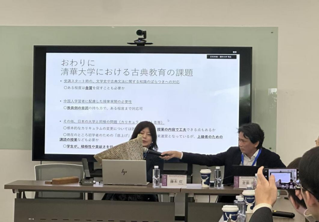 下午的论坛在清华大学外文系仓重拓副教授的主持下展开。藤本灯副教授首先以“清华大学日语专业日本古典教育:现状与课题(清華大学日本語学科における日本古典教育:現状と課題)”为题,分享了清华大学日语专业古典方向相关课程的授课经历和感想,结合与日本的大学中的古典文学、语言学教育的对比,提纲挈领地介绍分析了我校日语专业古典方向教育的目前情况及存在的问题,为国内日本古代文学、语言学教育提供了丰富且深刻的见解,并与参会的日方学者进行了积极的讨论。