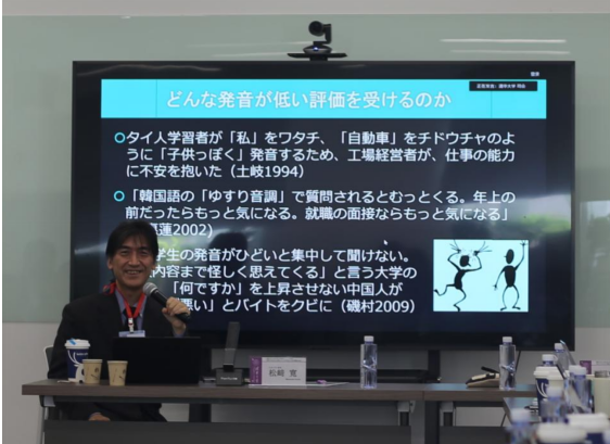 在随后的主旨报告环节,松崎宽教授以“日语声调、语调教育动向(日本語版アクセント・イントネーション教育の動向)”为题,进行了精彩的演讲。他系统梳理介绍了日语教育研究的发展历程及最新成果,结合日本社会现实,细致入微地探讨了日本国内外日语声调、语调教育的现状及问题,深入浅出地分享了关于面向外国学习者的语音教育的崭新视角及深刻见解,为全球日语教育研究及实践提供了详实、有益的参考。