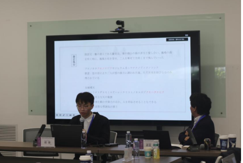 随后,清华大学日语专业博士生胡俊、李净宇分别以“《蒙求和歌》‘管弦部’的配置及构造(『蒙求和歌』「管弦部」の配列と構造について)”、“《和汉朗咏集》训法的比较:以书陵部本私注‘春部’为中心(『和漢朗詠集』の訓法の比較:書陵部本私注「春部」を中心に)”为题进行了研究汇报,展示了清华大学日本古典文学、文献学研究的最新成果,并与线上线下与会学者、学生进行了深入的讨论。