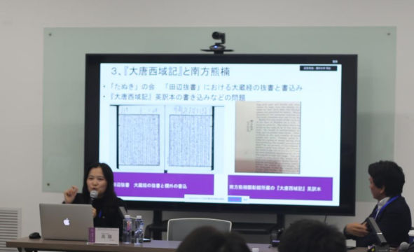 其后,清华大学日语专业高阳副教授以“《大唐西域记》在日本的传播与再生(『大唐西域記』の日本における受容と再生)”为题进行了主旨报告,借助《日本须弥诸天图》《玄奘三藏绘》飞鸟资料馆藏须弥山石等丰富多样的材料,旁征博引地分享了《大唐西域记》对于从古代到近代的日本文艺创作所产生的深远影响,清晰地勾勒出了日本人世界观变迁及中日文化交流的历史脉络。