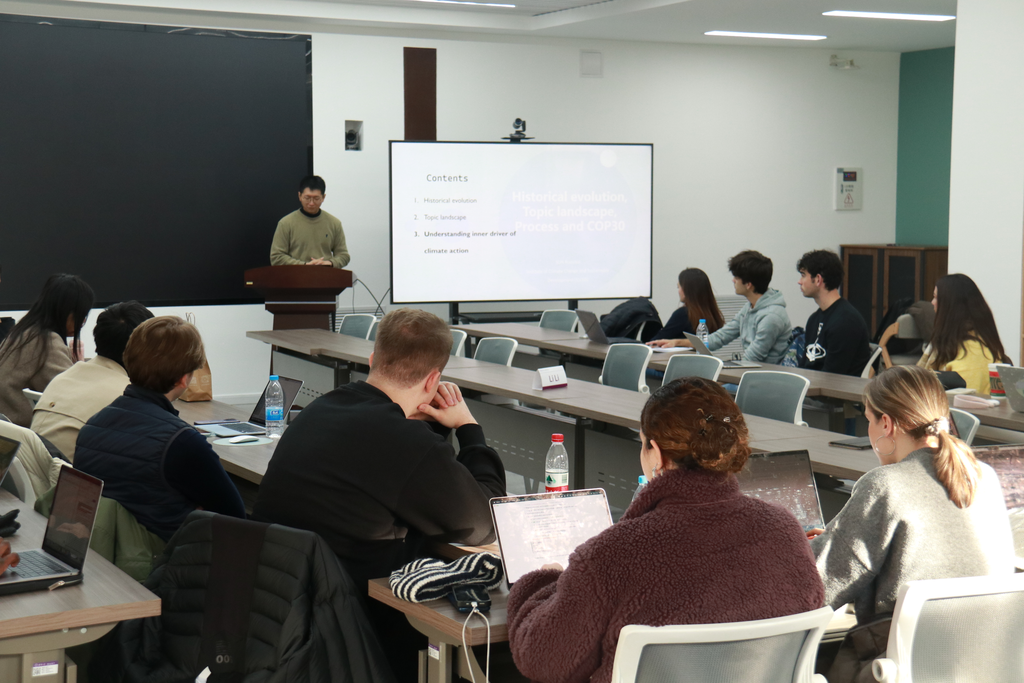 2025年12月13日上午,本次项目第一场研讨会——“联合国气候协定:历史演进和第30届联合国气候变化大会新动向”在文南楼116室举行。研讨会由清华大学气候变化与可持续发展研究院研究助理孙若水主讲。