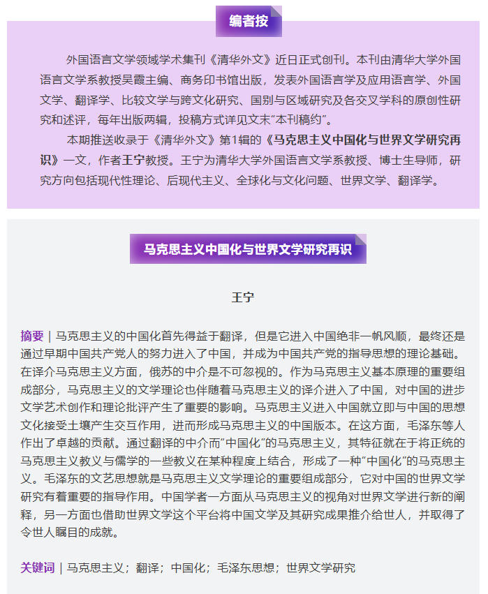 《清华外文》第1辑 | 王宁:马克思主义中国化与世界文学研究再识